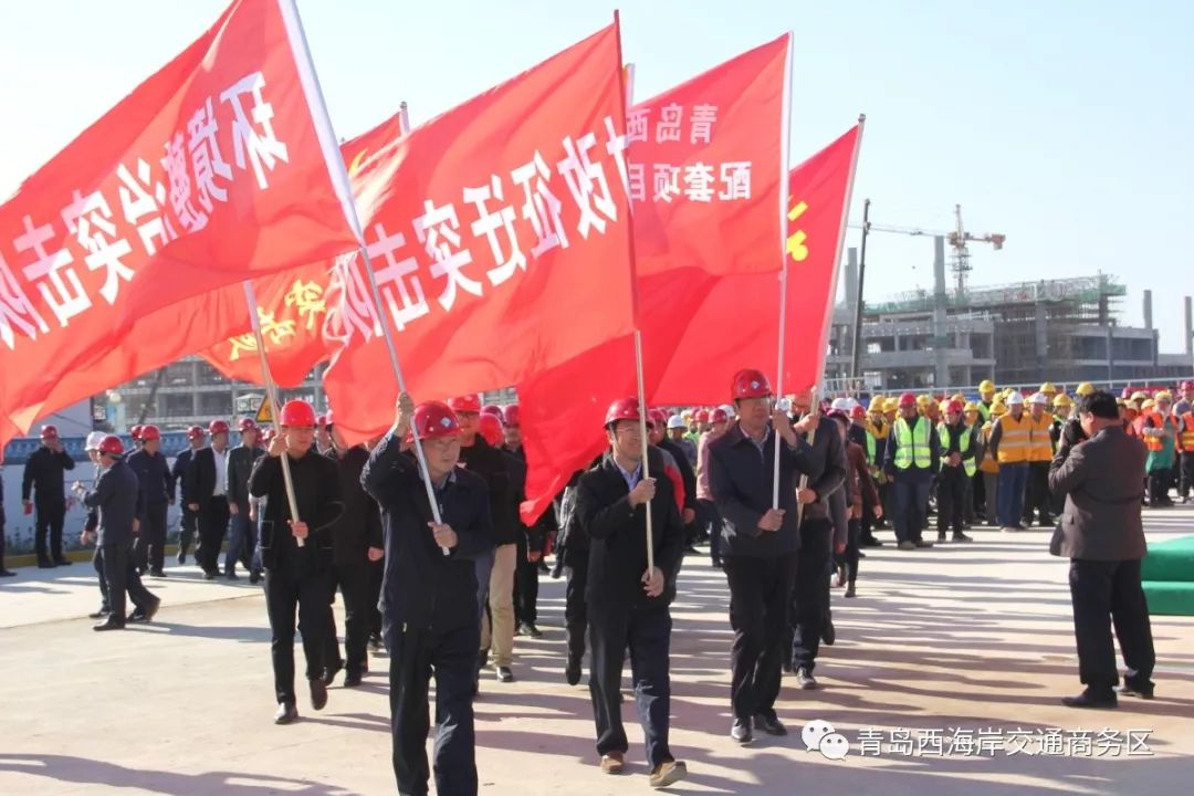 為深入貫徹落實新區(qū)工委、管委“突擊50天,決勝西客站”的部署,全面做好青島西站建成倒計50天的突擊工作,實現(xiàn)青島西站2018年12月20日開通運營的目標,10月29日,交通商務區(qū)在青島西站施工現(xiàn)場舉行了“突擊50天,決勝西客站”誓師大會。西海岸新區(qū)管委主任、區(qū)長李奉利,區(qū)委常委、副區(qū)長解宏勁,副區(qū)長、黨組成員顧清彌、區(qū)政府黨組成員劉記軍、區(qū)政府黨組成員劉元玉以及各相關(guān)部門、街道和全體參建單位參加了誓師大會。